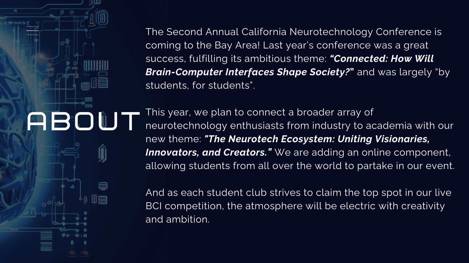 Neurotech@Berkeley is a student organization dedicated to all things brain and tech related. I joined this community as one of the first members on the design team, and became lead in following semester. I also served as head design and marketing lead for the first ever California Neurotechnology conference, held in UCLA in collaboration with 4 other UC schools.